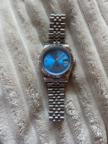 Inspired by the iconic Datejust design and featuring a prestigious automatic movement, we present the Seiko Mod Datejust in Baby Blue Arabic. A 36mm or 40mm high-end watch that blends timeless elegance with everyday versatility.