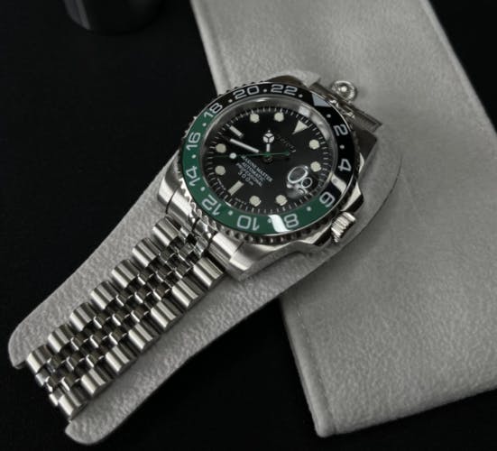 Inspired by the iconic GMT design and powered by a prestigious automatic movement, the Sprite Edition brings vibrant contrast and trusted mechanics together in one standout build. Featuring a striking ceramic bezel and stainless steel case, this 40mm Seiko Mod is designed for collectors who appreciate bold detail and functional versatility.