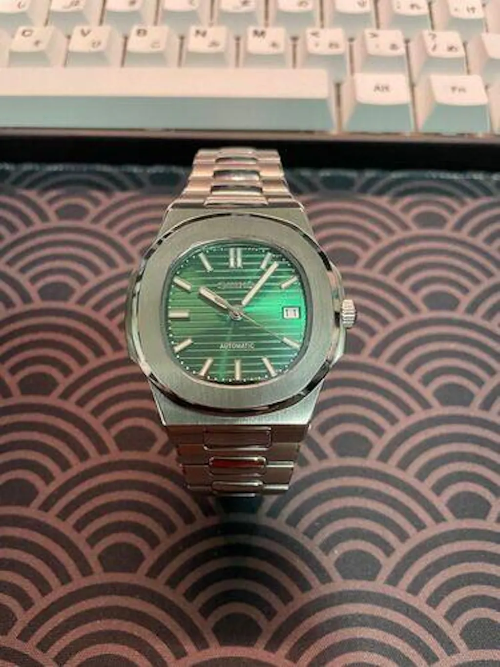 A striking green dial meets timeless steel craftsmanship—this Silver Nautilus Mod is bold, refined, and built for those who appreciate distinctive design with everyday durability.